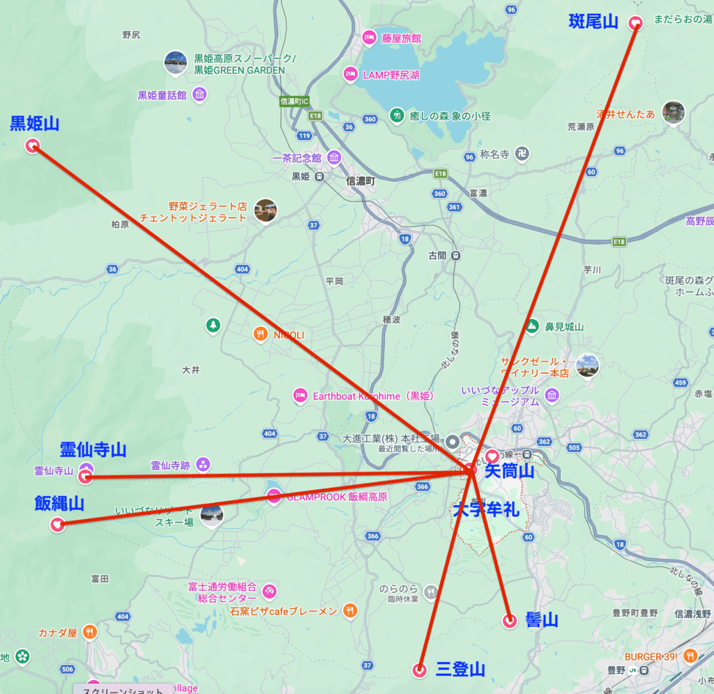 矢筒山からこの地域の山々(斑尾山・黒姫山・霊仙寺山・飯縄山・三登山・髻山)に向けて直線が引いてあります。これは周囲の山々への方位を測量したもののようです。