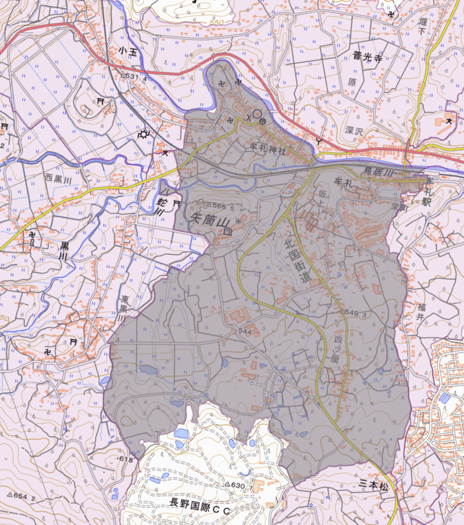 注:地図の下部の某カントリークラブに接する部分が白く不自然な抜け方をしていますが、これは何らかの理由でデータが入っていないようです。本来はこの部分も上の明治の地図と似た境界になっているのではないかと推測します。