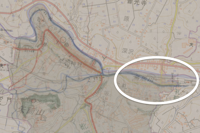 一点、栄町地区での鳥居川の流れが、古い地図の方は今と比べてだいぶ南側に曲がっていますが、これは実際にそういうものだったのか、それとも単に地図上で正しく描けていないのかは少し気になるところです。