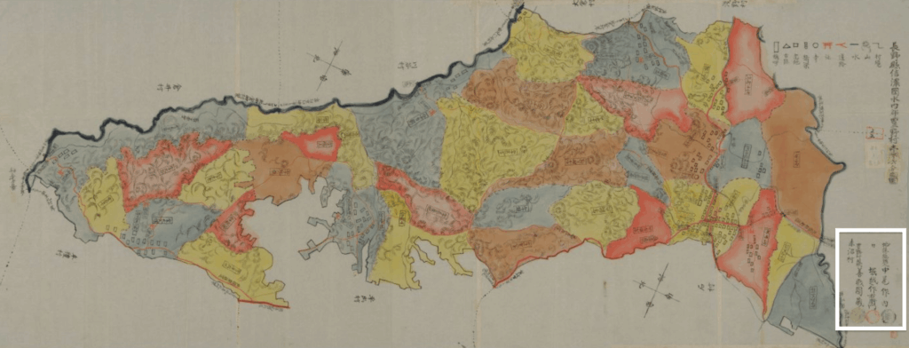 ところで、豊野村の地図に書かれた地図編集者の署名をご覧ください(上の地図で四角で囲んだ部分です)。