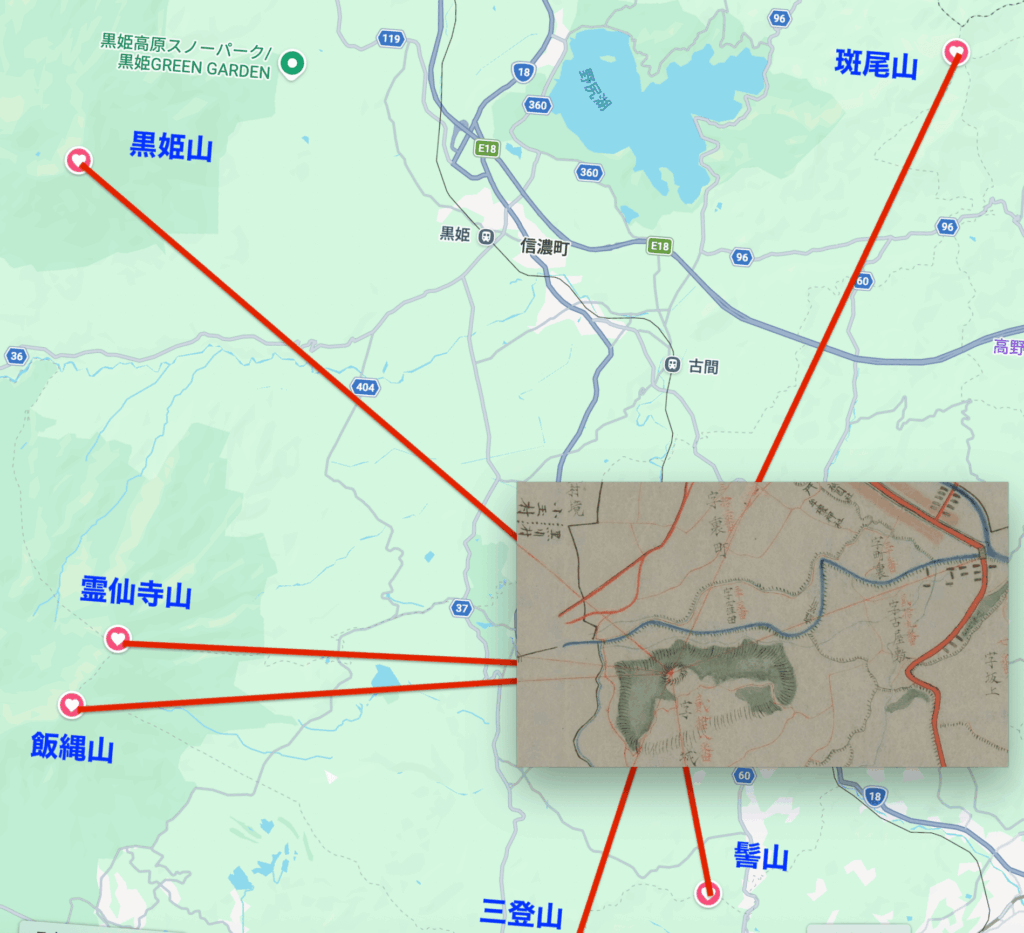 なお、既に上で書きましたが、飯綱山と黒姫山(地図左側の緑の丸)が実際よりはるかに近くに描いてあるのは意図的なものでしょう。