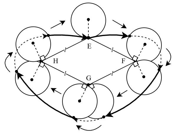 (菱形4辺分のサイクロイドの軌跡)+(角Fでの扇形の弧の軌跡)+(角Gでの扇形の弧の軌跡)+(角Hでの扇形の弧の軌跡)+(角Eでの扇形の弧の軌跡 = 0)