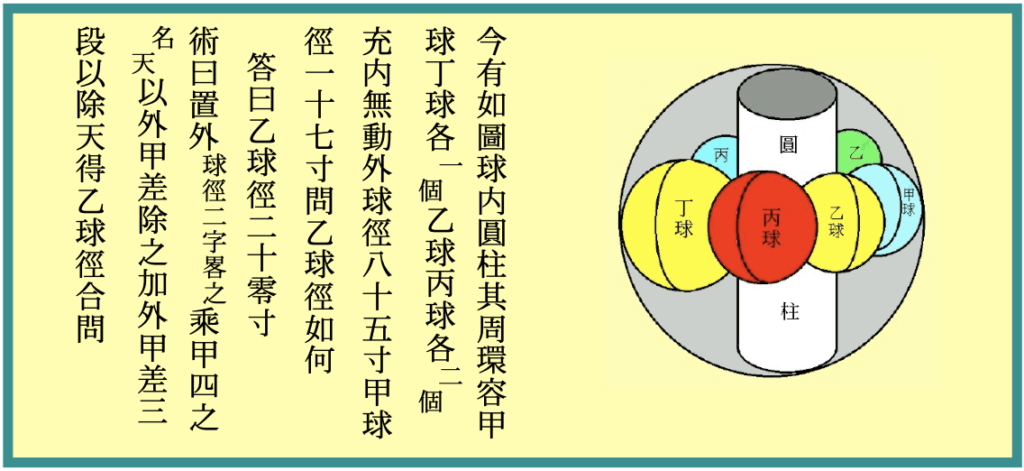 図のように球の内側に円柱があり、その周縁には甲球と丁球が各一つ、乙球と丙球が各二つ収まる。内部は空洞で、外側の球の直径は85寸、甲球の直径は17寸である。乙球の直径はいくらか。