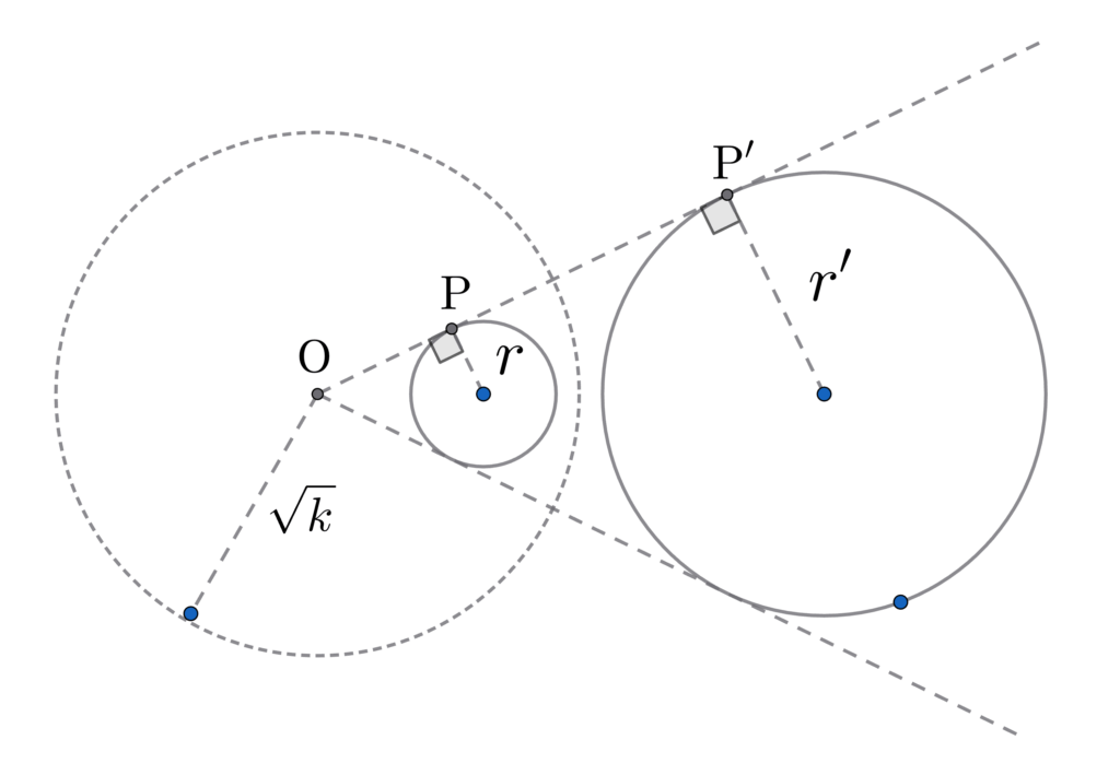 ここで原点が \(\rm{O}\) の反転の反率を \(k\) 、反転前の円の半径を \(r\) 、反転後の円の半径を \(r’\)、接線が反転後の円と接する点を \(\rm{P}’\) とすると次の関係が成り立つ:$$