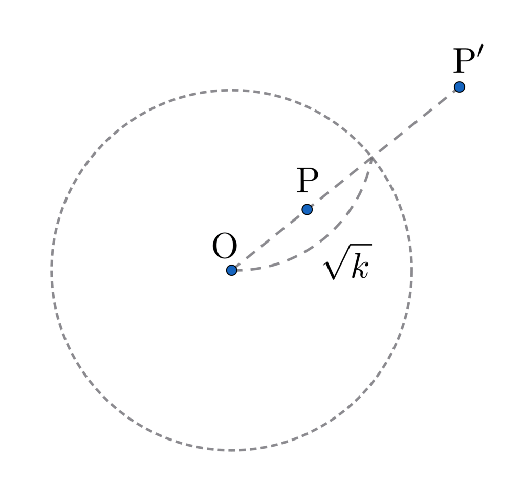 簡単な証明:\(r’/r = \overline{\rm{OP’}} / \overline{\rm{OP}}\) で、 \(\overline{\rm{OP}} \cdot \overline{\rm{OP’}} = k\) より \(\overline{\rm{OP}} = k / \overline{\rm{OP’}}\)、よって \(\overline{\rm{OP’}} / \overline{\rm{OP}} = \overline{\rm{OP’}} / (k / \overline{\rm{OP’}}) = \overline{\rm{OP’}}^2 / k\)、すなわち \(r’ / r = \overline{\rm{OP’}}^2 /k\)。