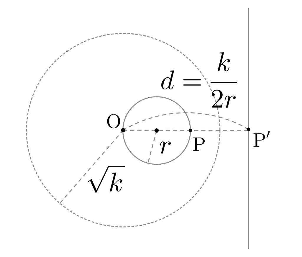 簡単な証明: \(\overline{\rm{OP}} \cdot \overline{\rm{OP’}} = k\) で、\(\overline{\rm{OP}} = 2r\) より \(\overline{\rm{OP’}} = k / 2r\) 。\(\overline{\rm{OP’}} = d\) でなのですなわち \(d = k / 2r\)。