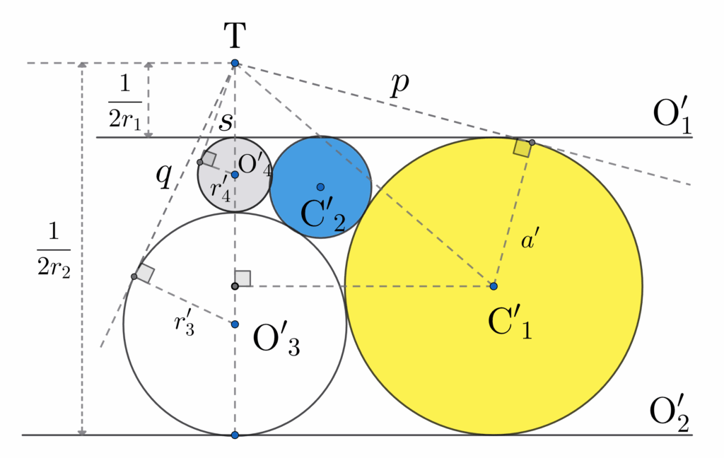 2つの平行直線 \( \rm{O}_1’\)、\(\rm{O}_2’\) 間に挟まれて並ぶ円で、(\(\mathrm{O}_3’\) の直径)+(\(\mathrm{O}_4’\) の直径)=(\(\mathrm{C}_1’\) の直径)になっているので$$