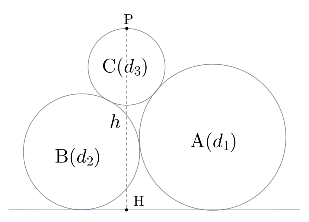 以下の図のような関係にある3つの円と接線に関し(\(d_1\)、\(d_2\)、\(d_3\) は円の直径、\(\overline{\rm{PH}} = h\) とする)、以下の式が成り立つ:$$