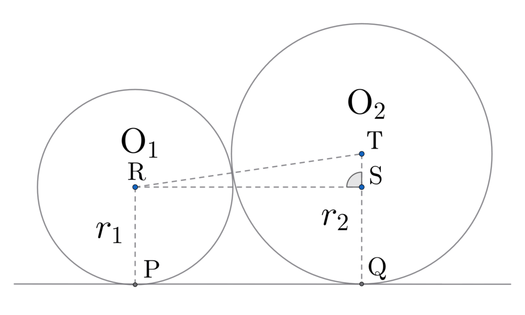 二つの大きさが異なる円が共通の接線に接している時、接線上の接点間の距離(図の \( \overline{\rm{PQ}}\))は