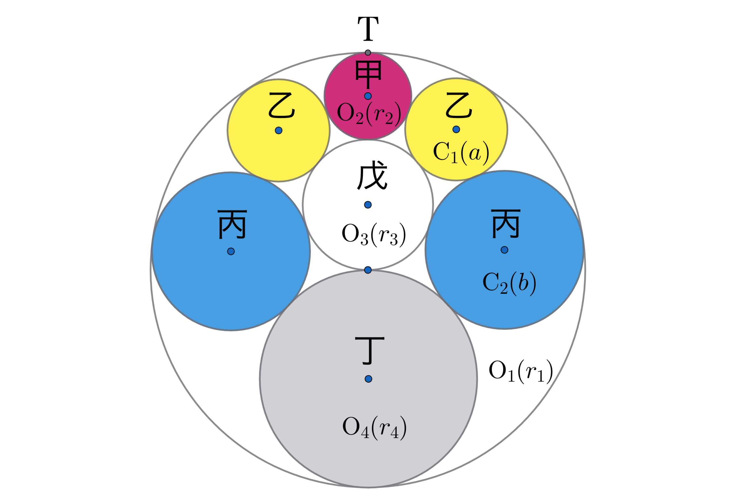 この問題の条件、および円の配置を再確認してみますと、構成要素のうち、外円と甲は