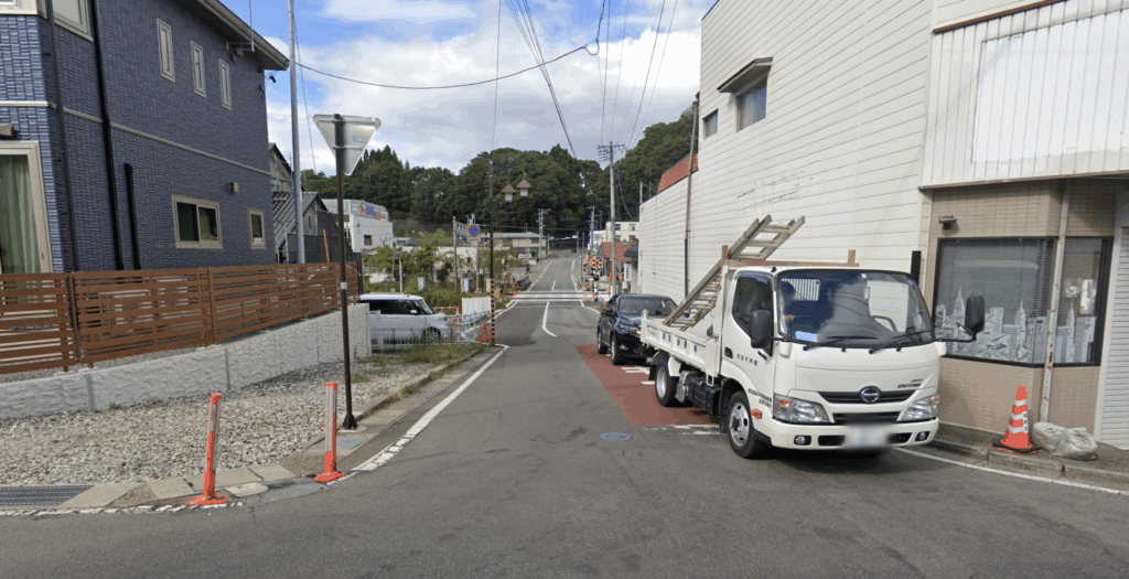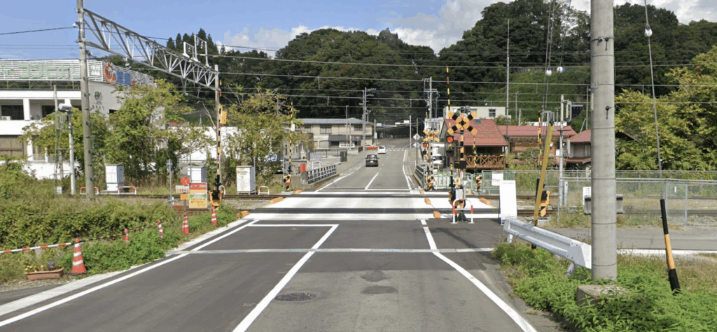 この栄町の角から国道18号の方に移動していきますと、まず線路の踏切があります。牟礼駅のすぐ横(写真のすぐ右側が牟礼駅)なので複数の線路が横切っていて大きいですね。