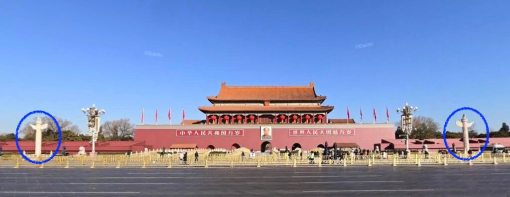 閑話休題、「華表」とは何かというとウィキペディアに華表の項目があり、それによると中国の、参道や入り口などの前に建てられる標柱のことだそうです。天安門前にもあるそうです。
