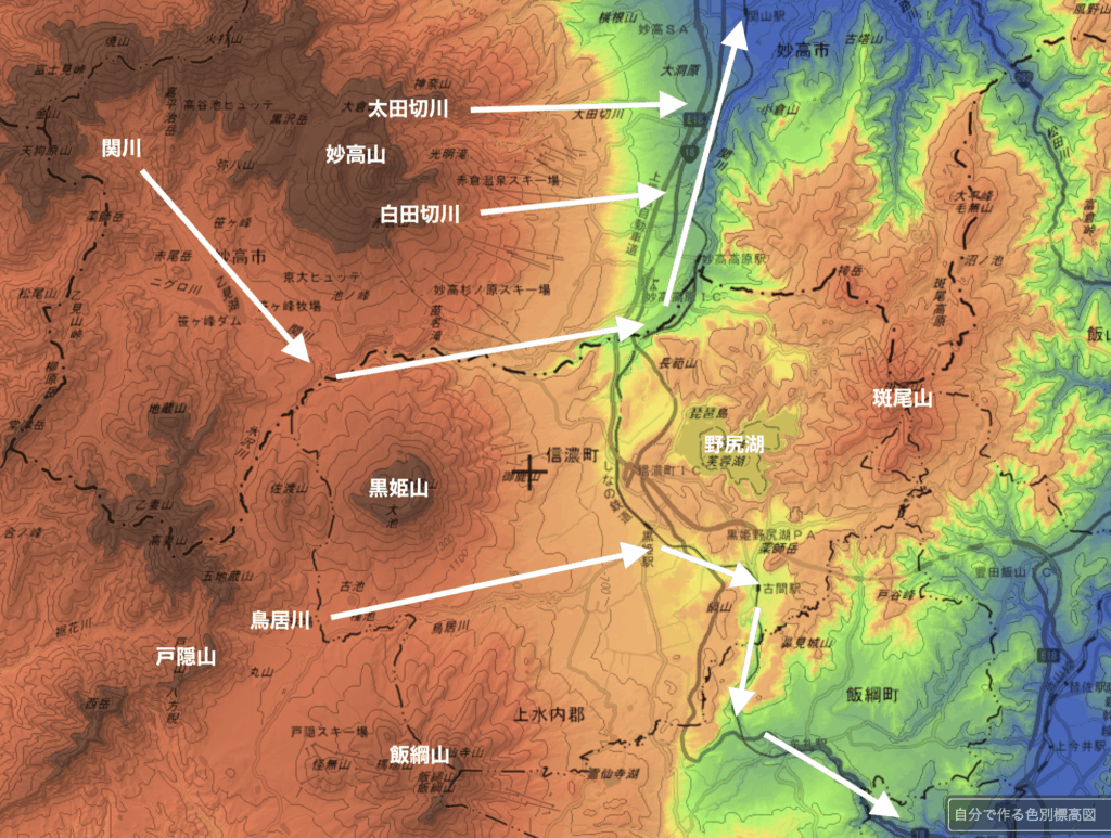 山があればその周りには川が流れるもので、実際この地域の大きめの川は割とそんな感じだったりします。妙高山・黒姫山・飯綱山の並びでは太田切川、白田切川、関川、そして今回のテーマである鳥居川などが、山を起点に東の方向へ流れ出す感じになっています。