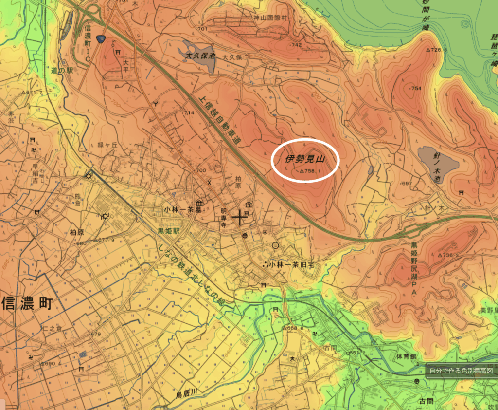 信濃町柏原にある高い場所ということで一つの場所を思い出しました。上の地図で鳥居川は進路を南に向ける場所、そのすぐ北側にあります。その名前は、「伊勢見山(いせみやま)」です。