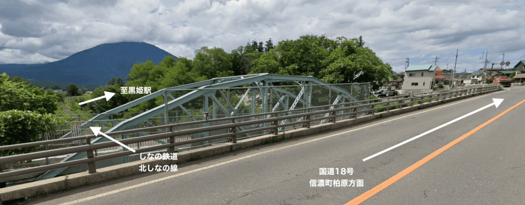 国道18号の、北上していって信濃町の古間から柏原に入る部分は、だいぶ上る感じになっていますよね。なので「あれっ、あんなところを車に比べて登坂能力がかなり劣る鉄道が登れるんだっけ?」と一瞬思ったのですが、上の地図でもわかるように黒姫駅は国道18号が通る柏原の通りより西側の、標高が低いところにあり、それで鉄道の勾配も道路(国道18号)に比べてだいぶ緩くて済んでいるようですね。