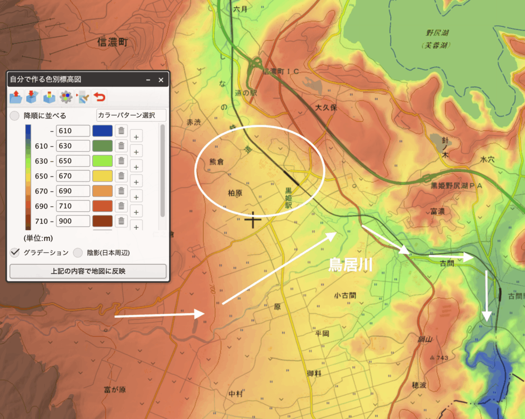 地理院の地図には画面中央の標高を表示する機能があり、それによると川が向きを変えている地点の標高は650m程度と出るので、それを中心に適当な標高の差分を選び、標高をカラーで表示します。今回少し試行錯誤したところ20m刻み程度がよさそうです。ではその高度が色分けされた地図を以下に示します: